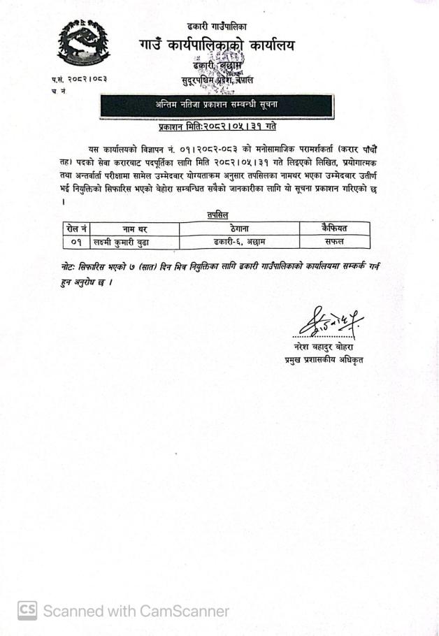 विज्ञापन नं ०१।२०८२-०८३ मनाेसामfजिक परामर्श कर्ता (करार पाँचौं) पदको अन्तिम नतिजा प्रकाशन सम्बन्धी सूचना