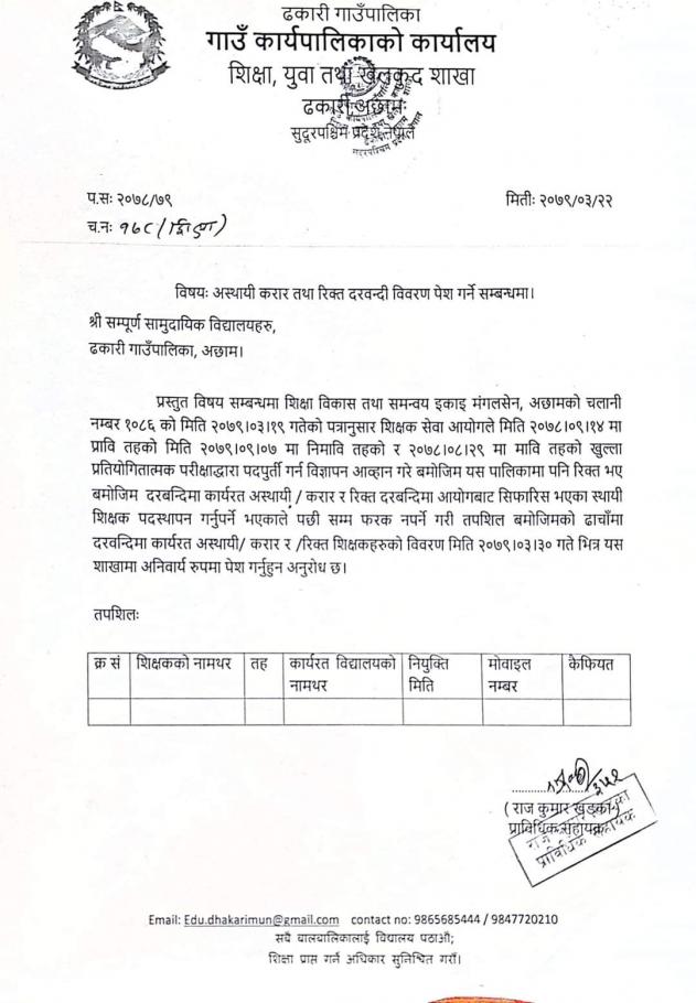अस्थायी करार तथा रिक्त दरबन्दी विवरण पेश गर्ने सम्बन्धमा।