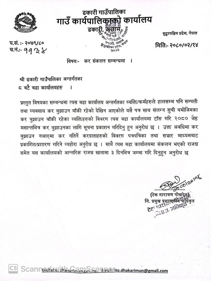कर संकलन सम्बन्धमा (वडा कार्यालय सवै) ।