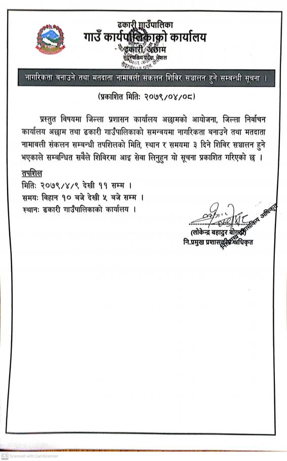 नागरिकता बनाउने तथा मतदाता नामवली संकलन गर्ने शिविर सञ्चालन हुने सम्बन्धि सूचना ।