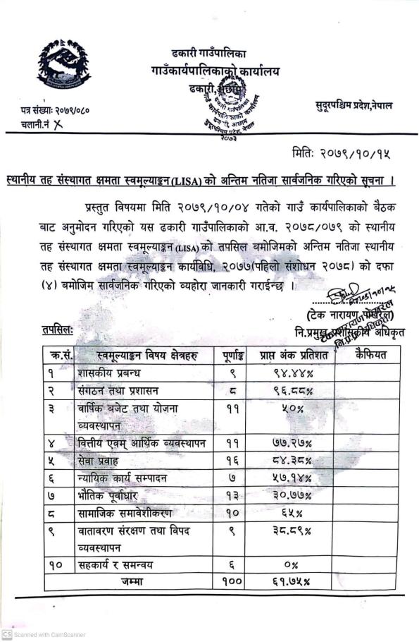 स्थानीय तह संस्थागत क्षमता स्व मुल्यांकनको नतिजा सार्वजनिक सम्बन्धमा ।